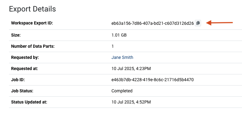 The workspace export id can be obtained from the web interface as per the below screenshot