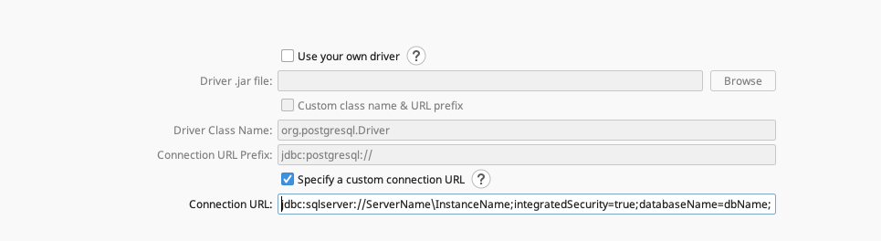 <hostname>\<instancename>. In this case you will need to add the instance name to the custom connection URLjdbc:sqlserver://ServerName\InstanceName;integratedSecurity=true;databaseName=dbName;trustServerCertificate=true;