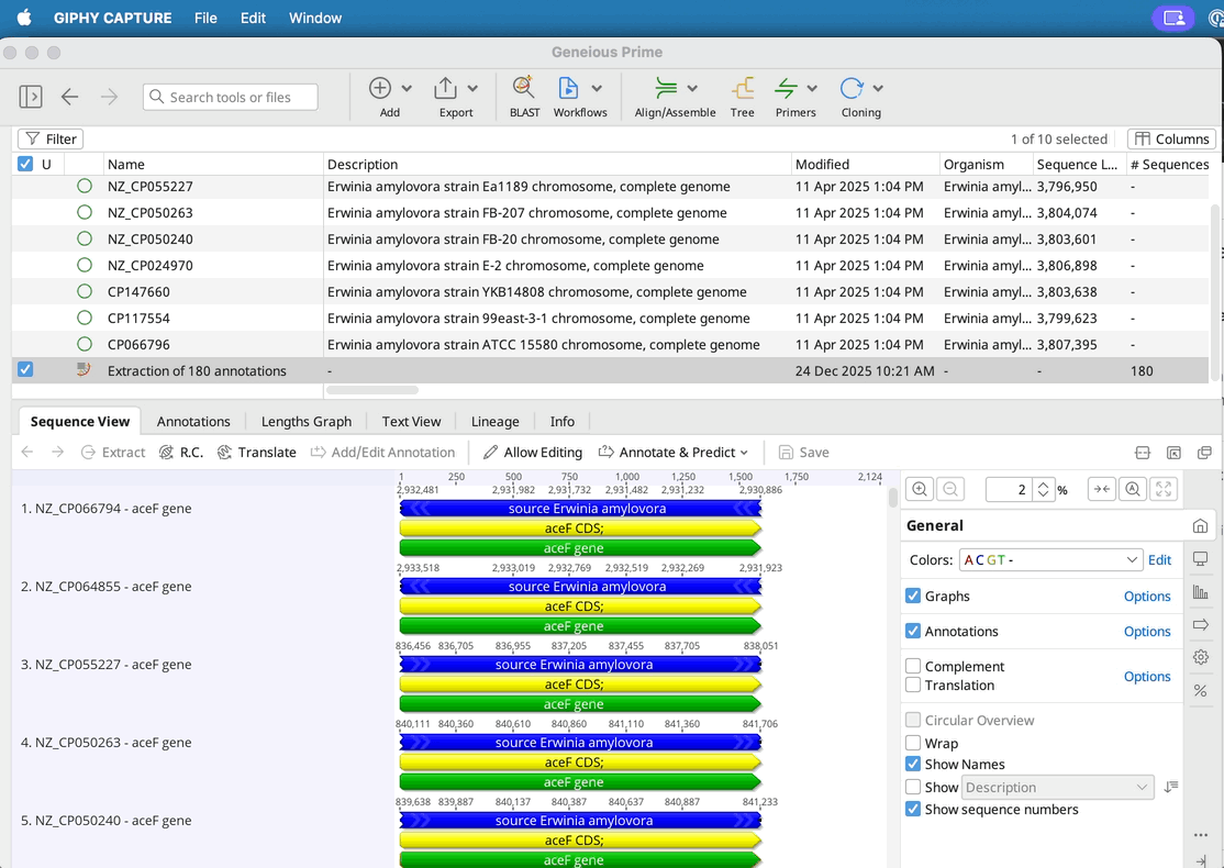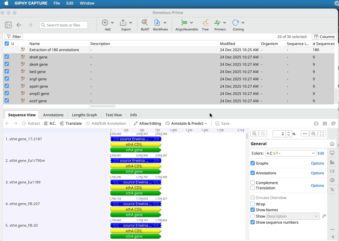 In this example, I'll start by extracting annotations from whole bacterial genomes. I have a list of gene annotations that I know exist in all of my taxa, so I'm simply filtering the annotations for those using an OR statement and clicking "extract".